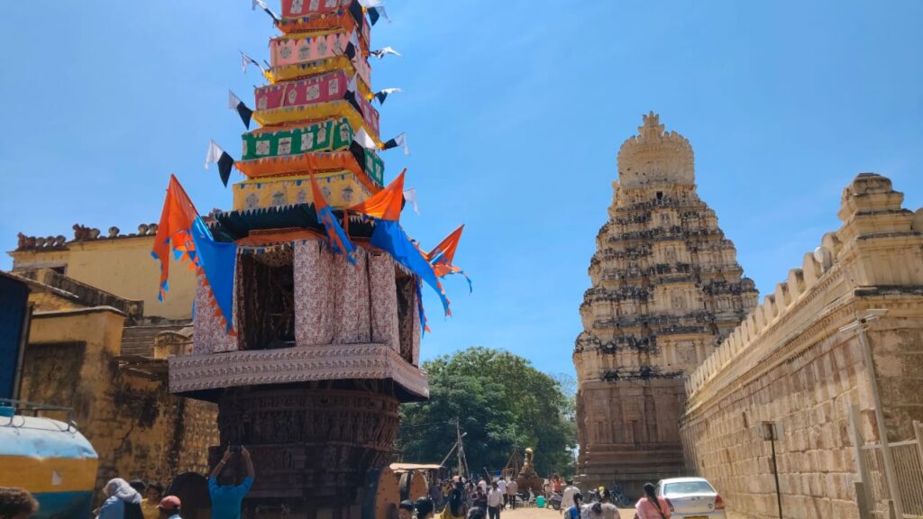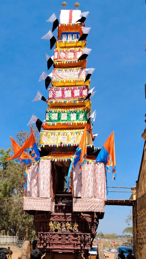 ಕಾಷ್ಠ ರಥಕ್ಕೆ ಸಿಂಗಾರ ಮಾಡಿ ಬಣ್ಣದ ಬಾವುಟಗಳಿಂದ ಅಲಂಕಾರ ಮಾಡಲಾಗಿದೆ